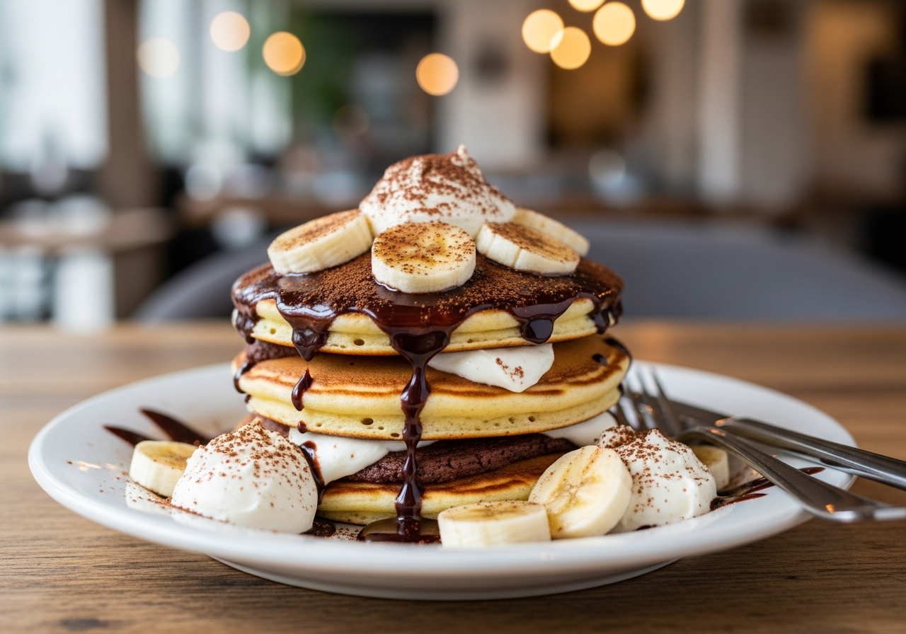 - パリパリチョコソース: 注文ごとに温かいパンケーキにかけることで、冷たいクリームやバナナとコントラストを生み出し、食感のアクセントになっています。