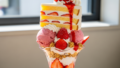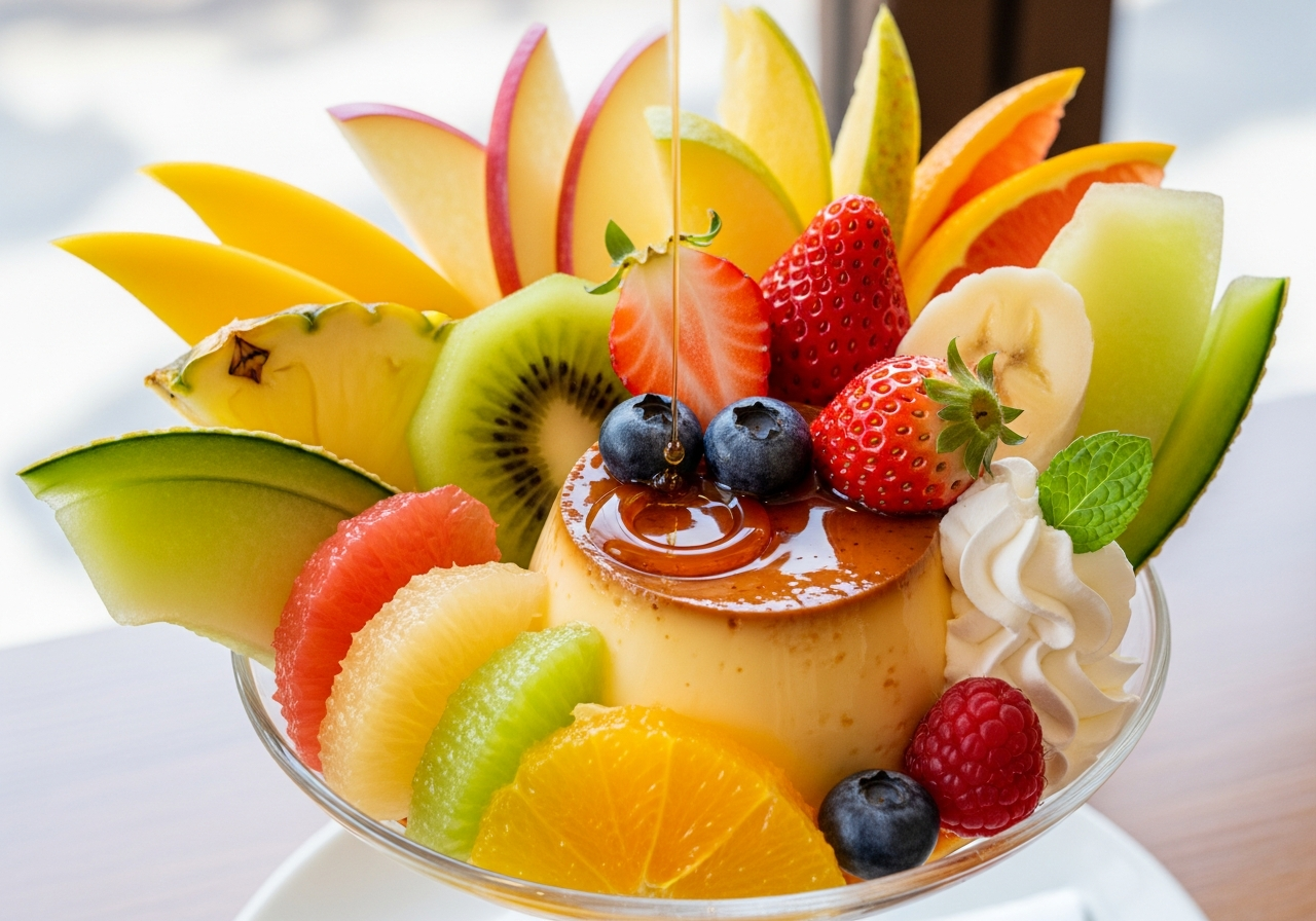 風車のプリンアラモードは、新鮮なカットフルーツがプリンの周りを彩り、まるでプリンの宮殿のような豪華な見た目を作り出しています。どの角度から見ても美しく、食べる前から心が躍ります。