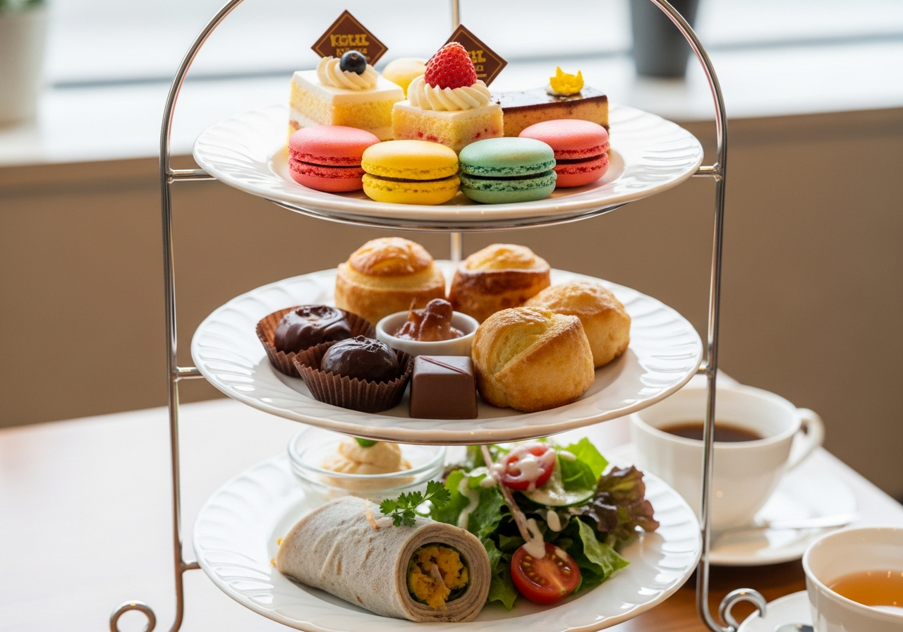 提供されるのは、ヨーロッパ風の美しい3段スタンド。一般的なアフタヌーンティーとは異なり、甘いものと塩気のあるもの(セイボリー)のバランスが非常に計算されており、最後まで飽きずに楽しめる工夫が施されています。
