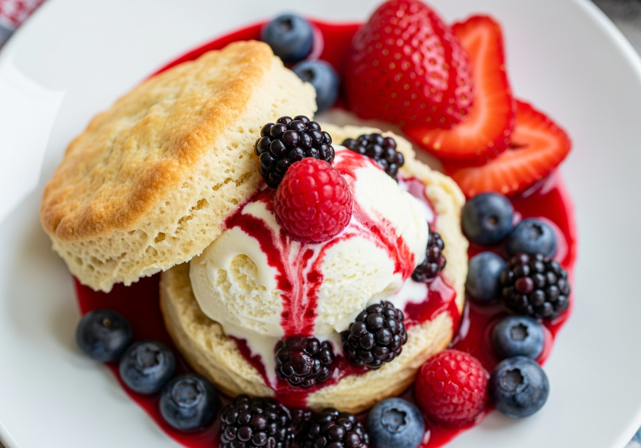 お皿の上にちょこんと並んだスコーン。その上には、鮮やかなベリーソースとぽってりとしたバニラアイスクリームが贅沢にトッピングされています。まるでおもちゃのような完成度の高さですが、香ばしいバターの香りが食欲をそそります。