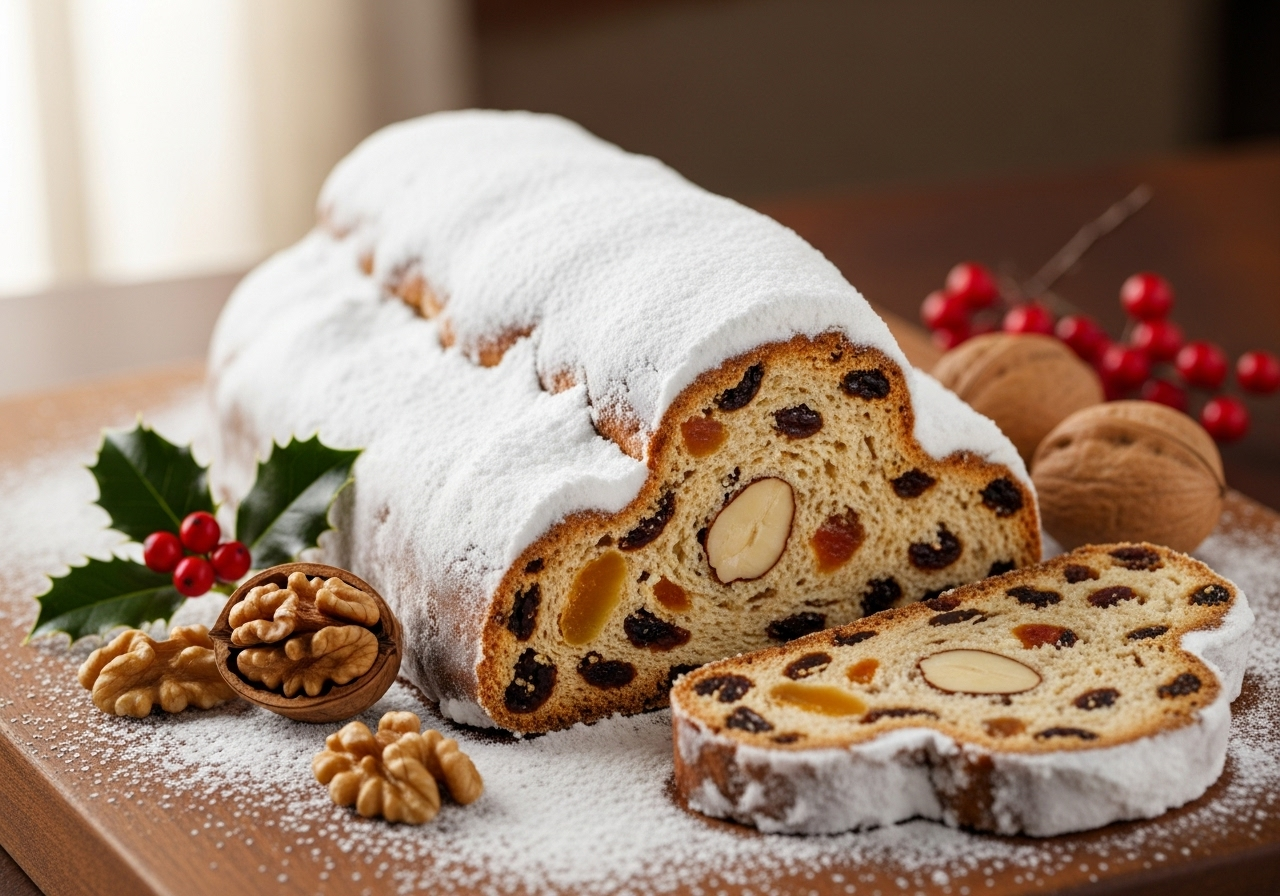 - 特徴: 中心部のマジパンのおかげで、生地全体がしっとりとしています。マジパンの濃厚な風味とアーモンドの香りが、ドライフルーツやスパイスと混ざり合い、非常にリッチで深みのある味わいになります。