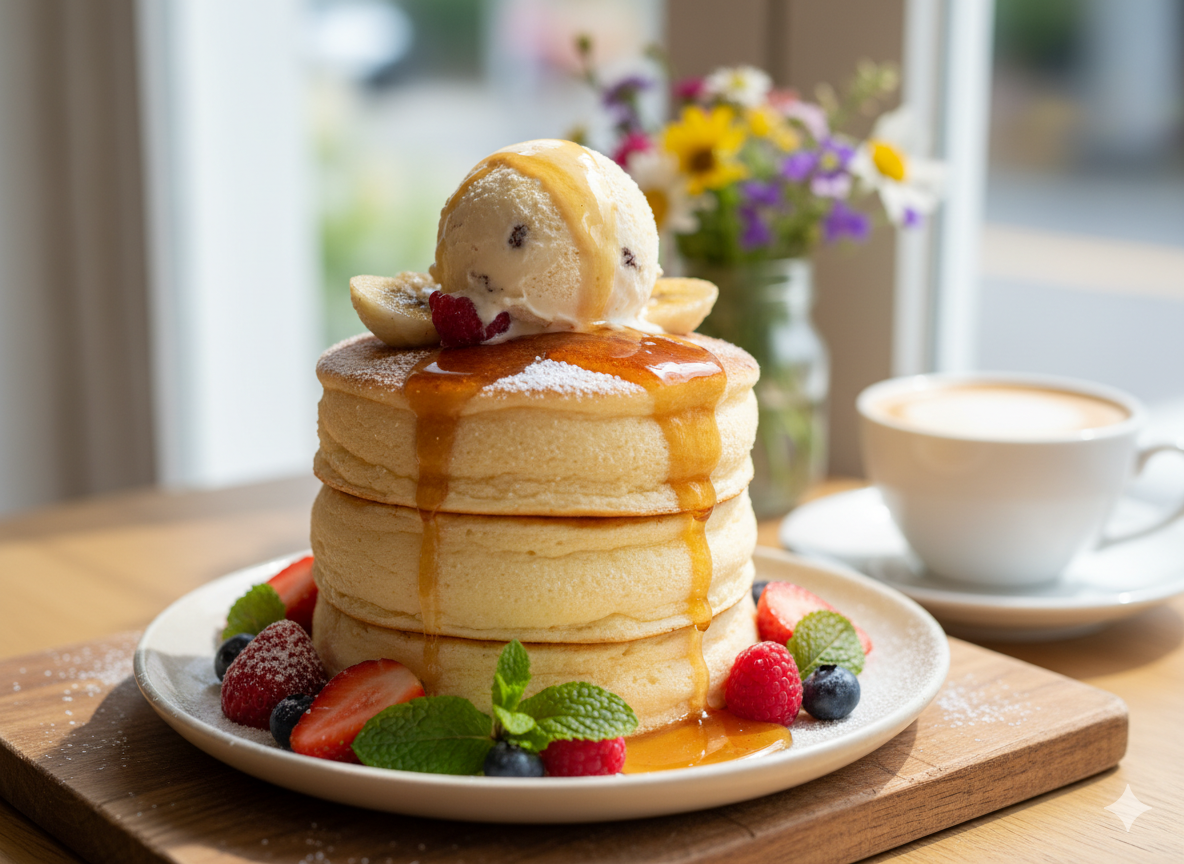 ここのパンケーキの特徴は、驚くほどの「ふわっふわ」感!注文を受けてから丁寧に焼き上げられるパンケーキは、優しく揺れるほど柔らかく、見るからに「とろける」食感であることが伝わってきます。